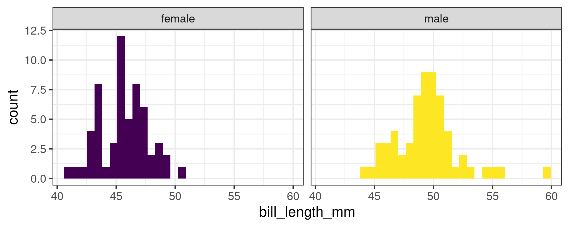 H0: The bill length of Gentoo penguins does not depend on sex.