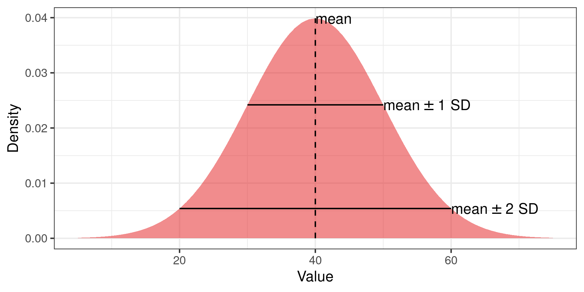 Square root of the variance \[s = \sqrt{s^2}\] \[s = \sqrt{\frac{\sum_{i=1}^n (x_i - \overline{x})^2}{n-1}}\] Same units as variable
